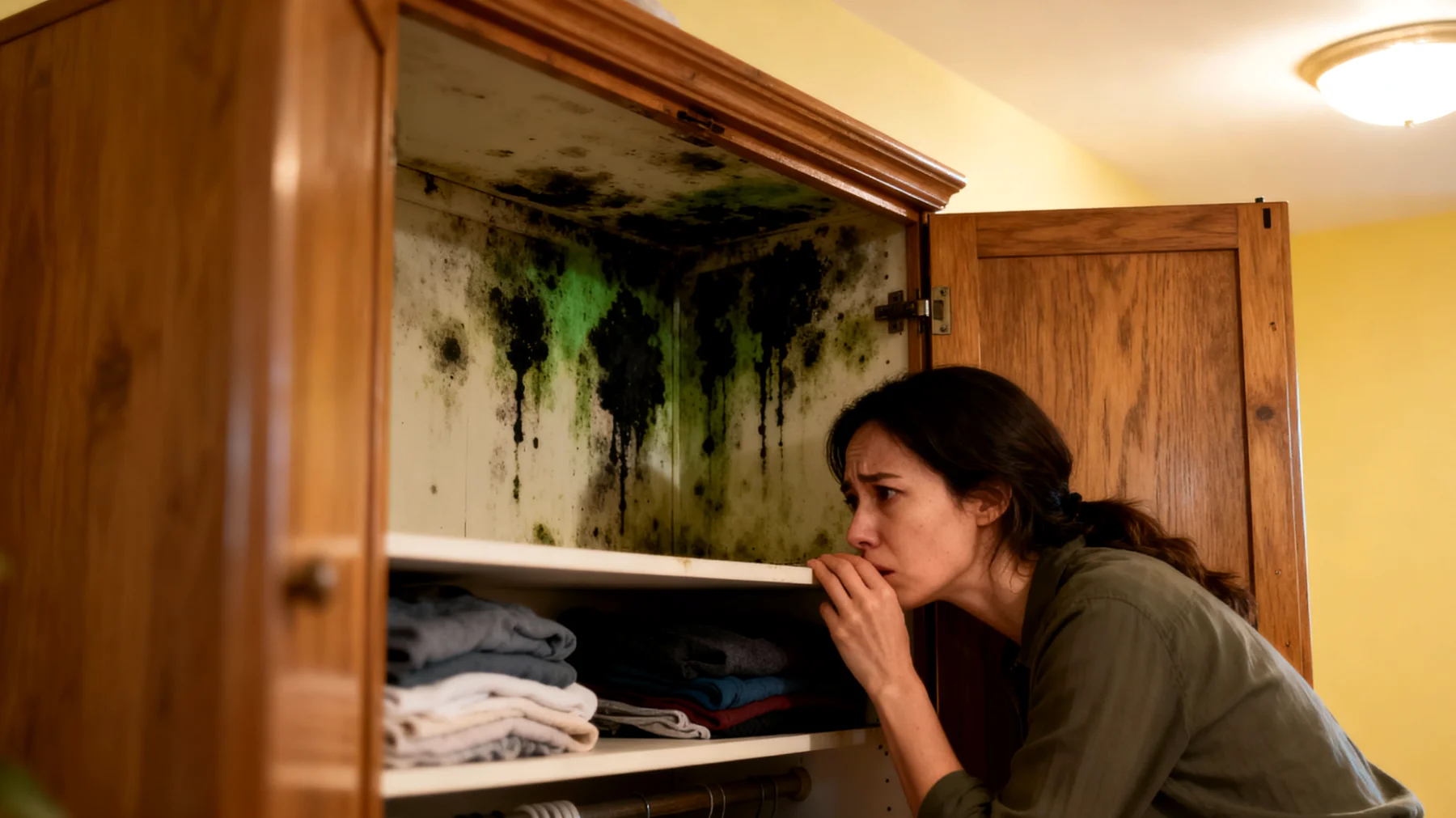 Queste condizioni creano l’ambiente ideale per la proliferazione di spore fungine, comunemente chiamate muffe. In pochi giorni, queste spore iniziano a emanare odori riconoscibili e persistenti. A quel punto, anche i vestiti iniziano ad assorbire quegli stessi odori, mentre il legno sviluppa macchie che difficilmente si rimuovono del tutto. L’effetto visibile — quelle macchie verdastre o nere negli angoli — è solo la punta dell’iceberg. Il vero danno è strutturale e si sviluppa in profondità nel materiale.